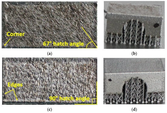 Comparative analyses were conducted on bridge samples built using scanning strategies of 90°, 67°, 90° strip, and 90° chessboard. Figure 5 depicts macrographs of the top and lateral surfaces of the samples before removal from the build plate.