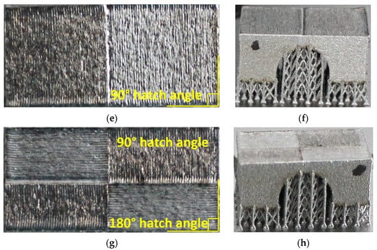 Figure 5. Macroscopic top and lateral views of the bridge pieces built with different different scanning strategies: (a,b) 67°, (c,d) 90°, (e,f) 90° strip, and (g,h) 90° chessboard.