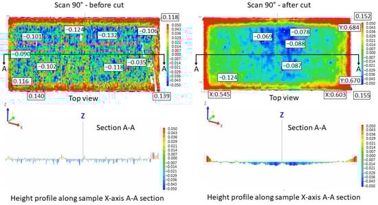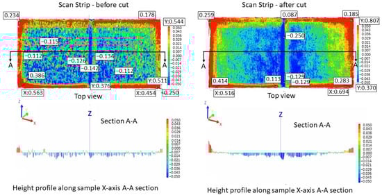 Figure 8. Height profiles of samples built using a 90° strip scanning strategy on the building plate before cutting (left) and after cutting from the building plate (right).