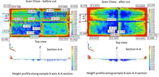 Figure 9. Height profiles of samples built using a 90° chessboard scanning strategy on the building plate before cutting (left) and after cutting from the building plate (right).