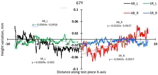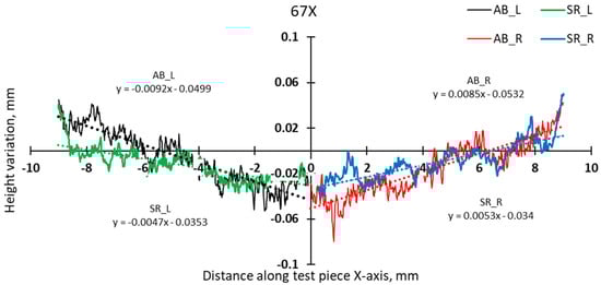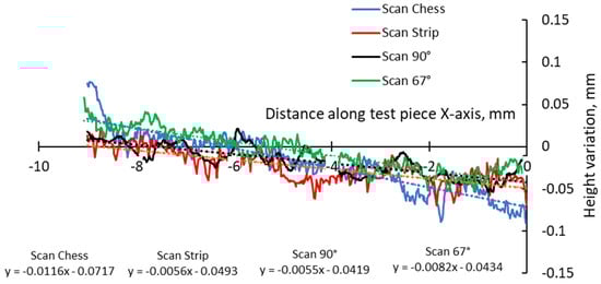 A more detailed analysis was conducted to specifically assess the effects of hatch angles, particularly at 90° and 67°. Figure 12 presents the complete height profile along the X-axis of the test pieces.