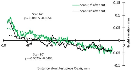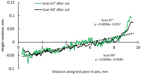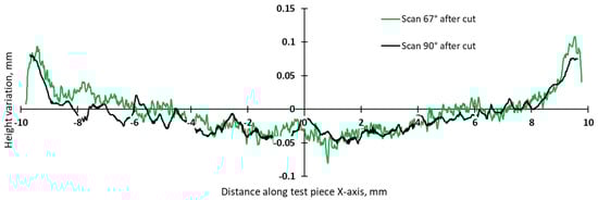 Figure 12. Height profiles along the X-axis of test pieces built using 67° and 90° scanning.