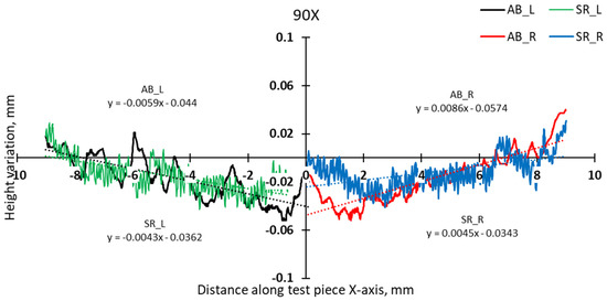 Figure 18. Comparison of height profiles of test pieces built in the X direction with the 90° scanning strategy and associated slopes (half left—L, half right—R).