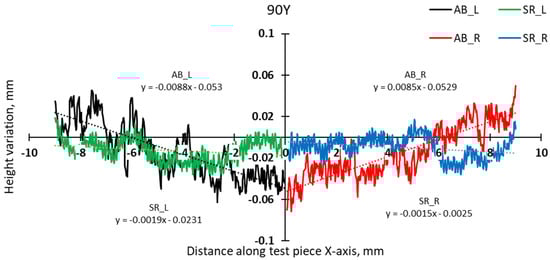 Figure 19. Comparison of height profiles of test pieces built in the Y direction with the 90° scanning strategy and associated slopes (half left—L, half right—R).