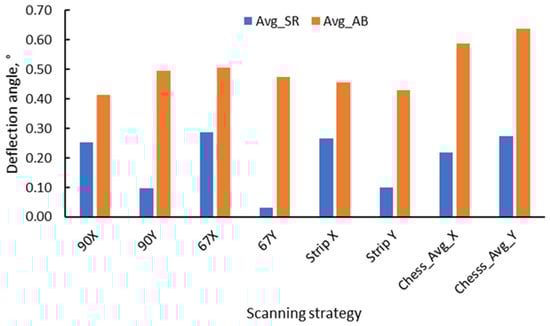 Figure 20. Average deflection angle of bridge test pieces built with different scanning strategies after cutting from the build plate.