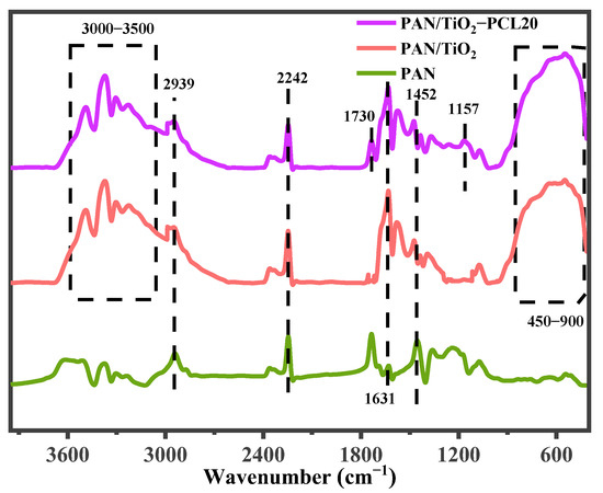The functional group characteristics of the PAN, PAN/TiO2, PAN/TiO2-PCL20 were investigated by FT-IR (Figure 1). The characteristic peaks of PAN were as follows: 1452 cm−1 and 2939 cm−1 (-CH2 symmetric and asymmetric stretching vibration), 2242 cm−1 (-C≡N stretching vibration) and 1631 cm−1 (-C=N stretching vibration) [39]. Compared with the FT-IR spectra of PAN, the broad band in the range of 3000–3500 cm−1 in PAN/TiO2 spectra corresponded to the stretching vibration of -OH, which was attributed to the introduction of TiO2 [40]. At the same time, the adsorption band at 450–900 cm−1 was attributed to the Ti-O bonds of TiO2 [41]. For PAN/TiO2-PCL20, the new peak that appeared at 1730 cm−1 belonged to the C=O stretching vibration, and the peak at 1157 cm−1 contributed to the C-O stretching vibration of PCL [42].