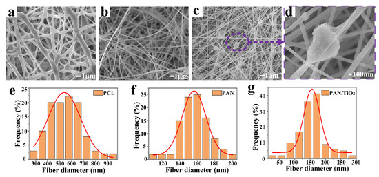 SEM of (a) PCL top layer, (b) PAN and (c,d) PAN/TiO2 substrate layer; Diameter distribution of (e) PCL top layer, (f) PAN and (g) PAN/TiO2 substrate layer.