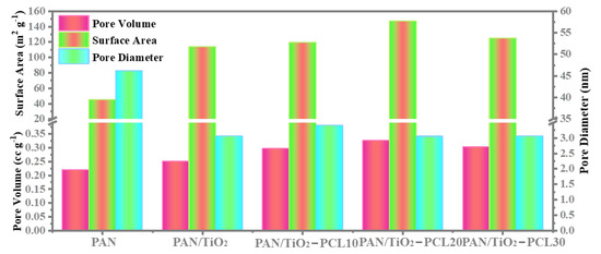 BET analysis of the PAN, PAN/TiO2 and PAN/TiO2-PCLx.