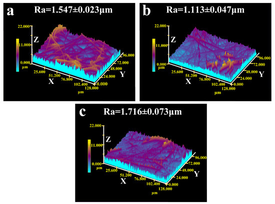 The average surface roughness (Ra) of the PCL layer, and the PAN and PAN/TiO2 substrate layers is analyzed in Figure 4. The Ra of the PCL layer and PAN substrate layer was 1.547 ± 0.023 μm and 1.113 ± 0.047 μm, respectively (Figure 4a,b). Compared with the PAN substrate layer, the Ra of PAN/TiO2 substrate layer increased to 1.716 ± 0.073 μm (Figure 4c). It could be observed that the surface roughness of the PAN/TiO2 substrate layer improved significantly. Owing to the impact of PAN on the hydrophilic layer, the larger roughness for PAN/TiO2 could lead to a further improvement in hydrophilicity [46], which could further increase the asymmetric wettability of the Janus membrane when combined with BET analysis.