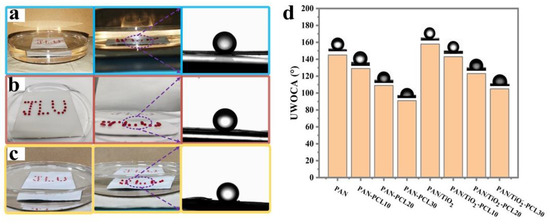 Oil droplets underwater onto (a) PAN, (b) PAN/TiO2, (c) PAN/TiO2-PCL20; (d) UOCAs onto PAN, PAN-PCLs and PAN/TiO2-PCLs with a different electrospinning time of PCL (10 min, 20 min, 30 min).