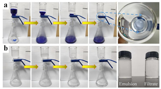 (a) Separation experiment of immiscible n-hexane-water mixture; (b) Separation experiment of n-hexane-in-water emulsion.