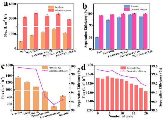 Figure 7a,b shows the separation performance of n-hexane-water mixture and n-hexane-in-water emulsion by different membranes. The permeate fluxes and separation efficiencies of PAN/TiO2 for mixture and emulsion were all higher than PAN. For PAN/TiO2-PCLx, the permeate fluxes and separation efficiencies for mixture and emulsion all increased rapidly and then decreased with the increase of PCL layer content. In summary, the PAN/TiO2-PCL20 possessed the highest permeate fluxes (5340 ± 60 L m−2 h−1 for n-hexane-water mixture, 1344 ± 35 L m−2 h−1 for n-hexane-in-water emulsion) and separation efficiencies (99.95% for n-hexane-water mixture, 99.52% for n-hexane-in-water emulsion).