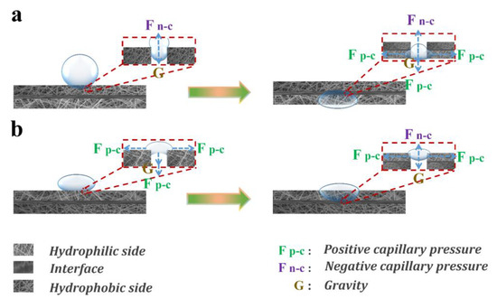 The asymmetric wettability of membranes might result in unidirectional water transfer capability [53]. The unidirectional water transfer capability of PAN/TiO2-PCL20 was further studied. When the hydrophilic PAN/TiO2 layer faced up, water merely spread on the surface of PAN/TiO2-PCL20 (Figure 11a). When the hydrophobic PCL layer faced up, water could spontaneously pass through PAN/TiO2-PCL20 (Figure 11b). PAN/TiO2-PCL20 exhibited unidirectional water transfer capability. The possible mechanism of unidirectional water transfer could also be explained, as illustrated in Figure 9: when the hydrophilic PAN/TiO2 layer faced up, water droplets continuously diffused to the surface of the membrane and formed a thin water layer. G value per unit area of water was less than the upward force to the water droplets provided by the hydrophobic PCL layer, meaning water would be blocked on the surface of PAN/TiO2-PCL20 (Figure 9b). When the hydrophobic PCL layer faced up, G value per unit area of water was higher than the repulsive force provided by the hydrophobic side counterpart. When G > Fn-c, water droplets passed through the PAN/TiO2-PCL20 by gravity and the capillary force of the substrate (Figure 9a). The result showed that the asymmetric wettability of PAN/TiO2-PCL20 exhibited unidirectional water transfer capability within a certain water pressure range [57,58].