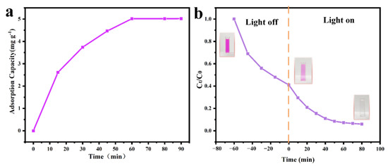 (a) Effect of adsorption time on adsorption capacity of PAN/TiO2-PCL20; (b) Removal performance of PAN/TiO2-PCL20 of RhB under simulated solar irradiation.