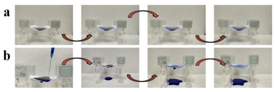 Unidirectional water transfer process of PAN/TiO2-PCL20: (a) PAN/TiO2 side facing water and (b) PCL side facing water.