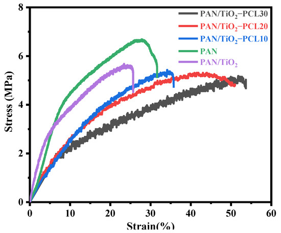 The mechanical performance of the separator was also necessary in the practical application for oil/water separation. Figure 12 shows the stress-strain curves of PAN, PAN/TiO2 and PAN/TiO2-PCLx. The tensile strength and train of PAN was 6.69 MPa and 28.67%, respectively. Compared with pure PAN, the tensile strength and strain of PAN/TiO2 substrate layer were reduced to 5.68 MPa and 25.33%, respectively, which might be attributed to the existence of bead structures and porosities in the PAN/TiO2. Compared to PAN/TiO2, the PAN/TiO2-PCLx possessed superior mechanical properties. With the increase of PCL content, PAN/TiO2-PCLx exhibited a decrease in tensile strength and an increase in strain. The PAN/TiO2-PCL30 had the most outstanding mechanical property and the maximum strain reached 53.67%. The result indicated that PAN/TiO2-PCLx all had good mechanical performance for oil/water separation (Figure S3).