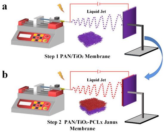 The fabrication process of (a) electrospinning PAN/TiO2 substrate; (b) electrospinning PCL layer on PAN/TiO2 substrate.