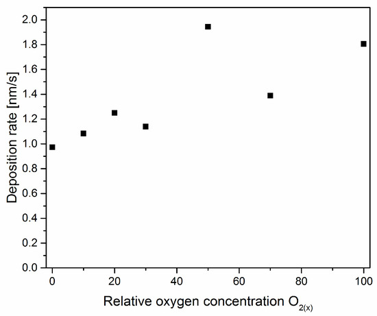 In Figure 2, the dependence of the deposition rate as a function of relative oxygen concentration is shown. There is a noticeable increase in the deposition rate with the amount of oxygen in the working chamber during the formation of the coating. The opposite effect was observed in ZrNxOy coatings formed by reactive rf magnetron sputtering [13].