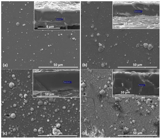 Typical cross-sections of the respective coatings are also provided as inserts in Figure 3. A dense and compact and columnar structure of coatings without porosity at the grain boundary can be noticed. The structure of the deposited coating can be classified as zone II according to the Thornton model, which is characterized by columnar grains and the occurrence of surface micro-roughness. At higher substrate temperatures, the mobility of the atoms increases. More nuclei are formed, which then grow into a compact columnar structure. Evaporated drops can also be observed on the surface of the coating formed, which have been partially embedded in the coating, Figure 3. The presence of solidified drops of the evaporated target on the surface of the coating is a characteristic feature of the deposition method used and is its disadvantage.