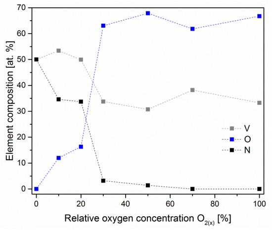 - In the V-N coating, the N/V ratio amounts to 1. The coatings formed with a relative oxygen concentration above 20% were characterized by a high oxygen concentration, above 60 at.%, and the (N + O)/V ratio is almost constant and amounts to about 2. This indicates a higher activity of oxygen compared to nitrogen in the formation of vanadium compounds;