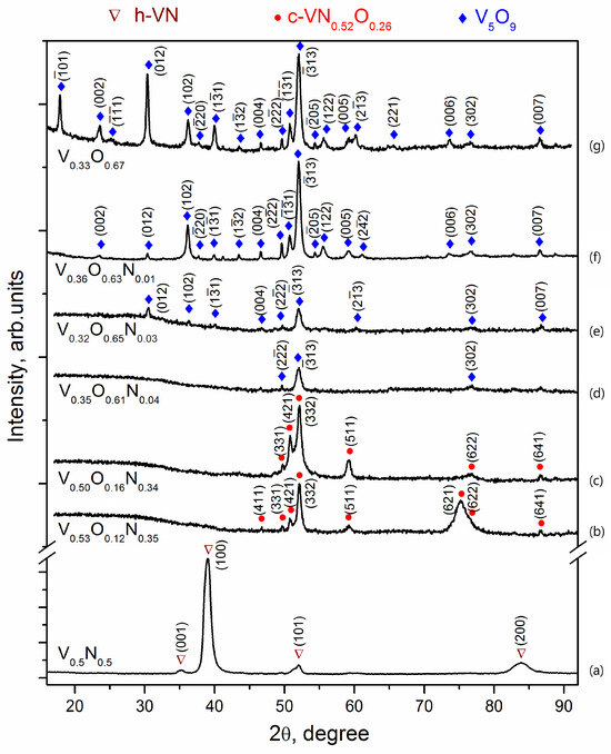 The crystal structure of V-O-N coatings changes as the elemental composition changes. Figure 5 shows X-ray diffraction patterns of coatings formed at different values of oxygen concentration in a gas mixture with nitrogen. According to the X-ray diffraction analysis, all the studied coatings can be divided into four types according to their phase composition: the first type is presented in Figure 5a, the second in Figure 5b,c, the third in Figure 5d,e, and the fourth type in Figure 5f,g.