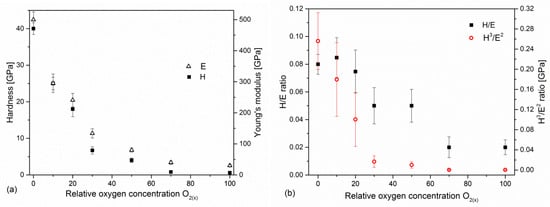 In recent years, the significant role of the elastic properties of the coating has been emphasized, and the ratio of hardness and modulus of elasticity: H/E [45] and H3/E2 [46] is presented as a parameter by which can predict the wear. The H/E ratio is related to the elastic deformation to failure of the coating (the coating’s susceptibility to loading), while H3/E2 is an indicator of resistance to plastic deformation, and an increase in this ratio leads to an improvement in load capacity. Plastic deformation of the coating/substrate system significantly intensifies the wear in the sliding contact. Both H/E and H3/E2 ratios show that the nature of hardness changes and decreases with oxygen concentration in the coating, Figure 6b.