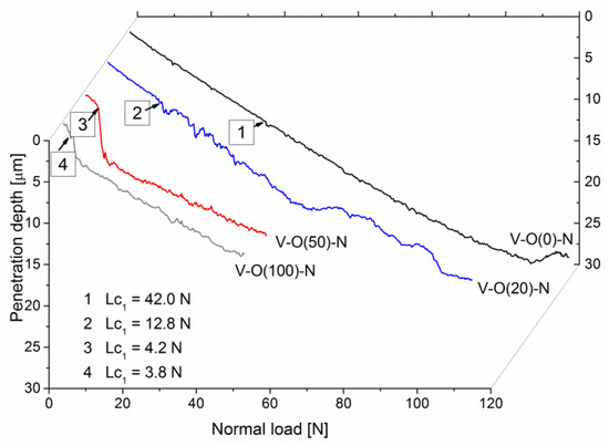 The penetration depth of the V-O(0)-N coating increases almost linearly to about 25 μm, with the normal load increasing to about 95 N, Figure 7. This is possible due to the high hardness of the coating and the plastic deformation of the steel substrate. In the V-O(20)-N coating, the linear increase in the penetration depth occurs up to about 15 µm with a normal load of about 50 N. A significant difference during the curve is observed. In the latter, it is smooth to a penetration depth of about 5 μm (for a load of about 13 N). In the other curves presented in Figure 7, the linear nature of changes in the penetration depth is much shorter, and with a normal load of about 4 N, the penetration depth increases significantly. At higher depths, the curves are wavier due to the vertical movement of the indenter during coating fracture and the horizontal movement of the coating-substrate system. An increase in the penetration depth is observed with a decrease in the hardness of the coating.