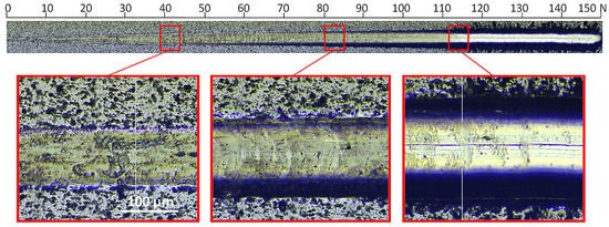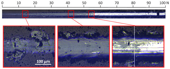 Enlarging the image of the characteristic areas of the scratch indicates significant differences between the coatings. The coating formed without oxygen with a relative oxygen concentration of 0% shows excellent resistance to damage and higher critical loads (Figure 8).