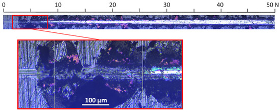 Optical micrograph of the scratch path of the V-O(50)-N coating, made under a load of up to 50 N and selected critical failure area.