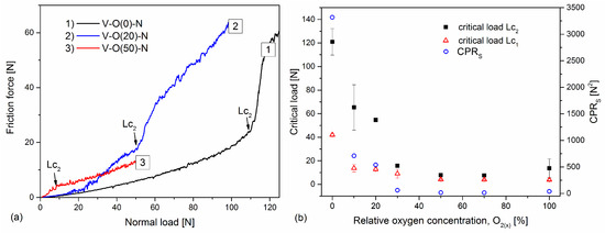 The friction force is dependent on normal load (a) and critical loads (Lc1 and Lc2) and CPRs parameter of V-O-N coatings (b) formed at various relative oxygen concentrations.