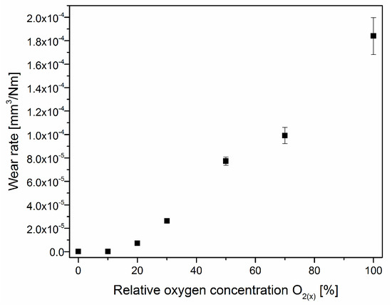 The V-O-N coating wear rate increases with the oxygen content in the coating, Figure 12. The lowest wear rate is for the coating formed without oxygen, (1.1 ± 0.2) × 10−7 mm3/Nm. A comparable value is shown in the coating with 12% oxygen concentration, formed in an atmosphere with a relative oxygen concentration of 10%. The increase in oxygen in the working atmosphere during the formation of the coating reduces its wear resistance. It should be emphasized that with the decrease in the hardness of the coating, the sliding distance was also reduced so that the coating was not completely worn away.
