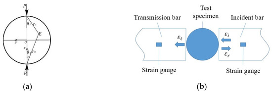 Indirect tensile methods are commonly used to obtain the tensile strength of brittle materials. Among these methods, the Brazilian disc splitting test is one of the most widely applied measurement techniques. The Brazilian disc splitting test was developed based on the theory of two-dimensional plane elasticity. Its theoretical model involves a circular specimen subjected to a pair of equivalent reverse radial forces, as shown in Figure 2a. Figure 2b is the clamping position of the specimen in the SHPB test device.
