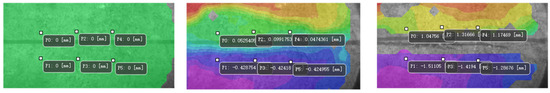 The Digital Image Correlation software Vic-2D version 6.2.0 (Correlated Solutions Inc., Columbia, SC, USA) was used to process the speckle images captured during the impact failure process of the specimens, as shown in Figure 5. Initially, three sets of measurement points corresponding to upper and lower positions were selected on the speckle image of the specimen. Then, the software was employed to measure the crack width between these three sets of measurement points, and the arithmetic average of the crack widths from the three sets was calculated as the final crack propagation width. Finally, the variation in crack width on the specimen’s surface over time was obtained, as illustrated in Figure 6.
