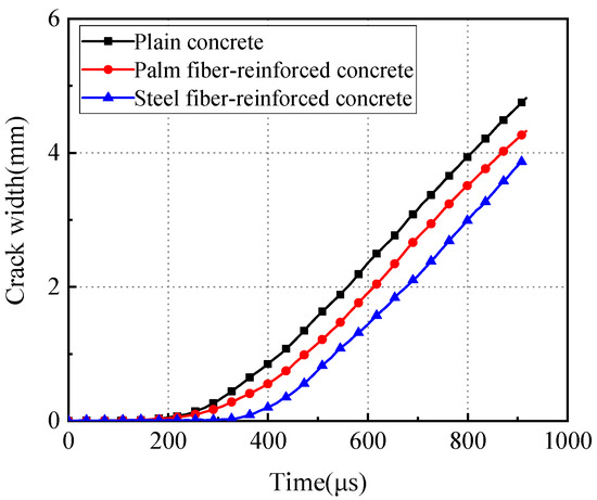 It can be observed that, under the impact load, plain concrete is the first to develop cracks, followed by palm fiber-reinforced concrete, while the cracking initiation of steel fiber-reinforced concrete noticeably lags behind the former two types. Furthermore, at the same time point, the crack widths of palm fiber-reinforced concrete and steel fiber-reinforced concrete were significantly smaller than those of plain concrete, indicating that the inclusion of fibers effectively impedes crack propagation. Moreover, steel fibers exhibit a better crack resistance effect on concrete compared to palm fibers.