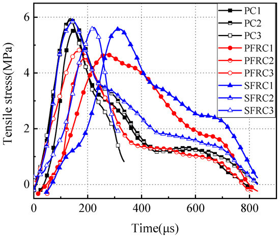 Dynamic tensile stress time–history curve of the specimens. Plain concrete specimens (PC), palm fiber-reinforced concrete specimens (PFRC), and steel fiber-reinforced concrete specimens (SFRC).
