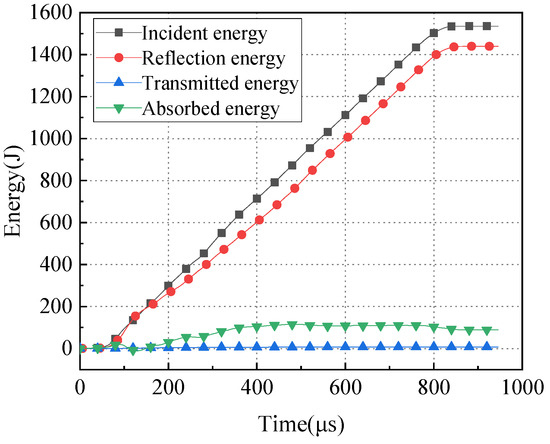 Based on the strain measurements of incident waves, reflected waves, and transmitted waves in the split Hopkinson pressure bar test, the energy carried by these waves can be calculated. Taking a steel fiber-reinforced concrete specimen as an example, the energy variation over time during the dynamic splitting process of the specimen is shown in Figure 8.