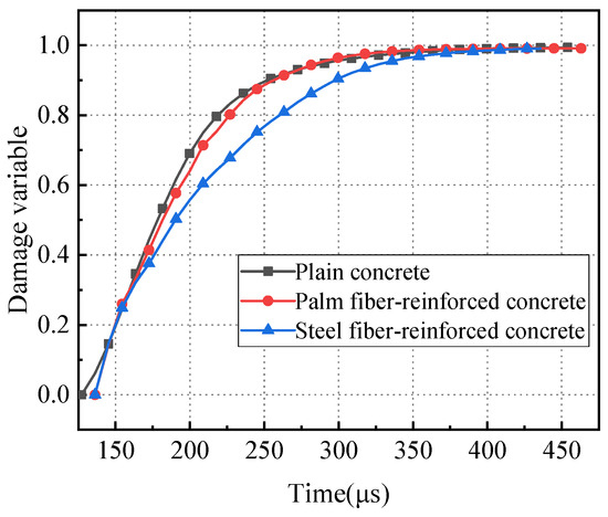 The initial Young’s modulus of the three kinds of concrete specimens was calculated by taking 60% peak stress and the corresponding strain as the representative values in this paper. The initial Young’s modulus of plain concrete, palm fiber concrete, and steel fiber concrete are 21.19 GPa, 16.03 GPa, and 25.99 GPa, respectively. Based on the dynamic tensile stress–strain curves for the three types of concrete specimens and Equation (8), the relationship between the specimen damage variables and the time of impact loading was determined, as shown in Figure 11.