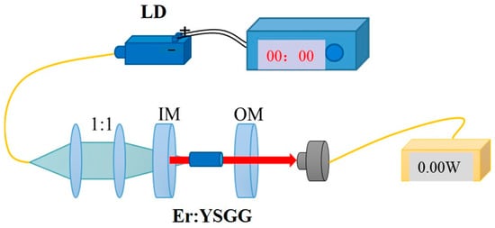 The laser experimental setup (seen Figure 1) was built to explore the laser performance. The pump light was focused on Er: YSGG SCF with a 1:1 coupling system. In order to obtain a high laser output, we used different transmission plane output mirrors (OM) to optimize the system. Moreover, the cooling of the crystal was realized by wrapped it in indium foil, and the crystal was fixed in a copper heat sink. This cooling system can help to remove the heat and keep the temperature at 15 °C.