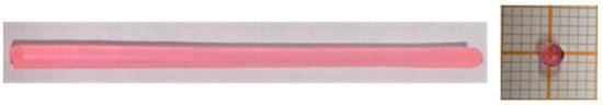 Er: YSGG SCFs with diameter of 2 mm were successfully obtained using the μ-PD method. The SCFs length can reach up to 100 mm, and the color of the crystals was pink (Figure 2). Because of the volatilization of Ga2O3, the surface of the Er: YSGG showed non-transparent relatively, while the cross section was transparent without any volatiles. As the growth rate was changed from 1 mm/h to 5 mm/h, and mixed gas atmosphere mentioned previously was used to restrain volatilization of Ga2O3, the quality of the crystal was further optimized. The optimized fast growth speed is beneficial to decrease the corrosion of gallium since the as-grown crystal can deviate from the growing region rapidly. The XRF result (Table 1) showed that the components of crystal were (Er0.27Y0.71)3Sc2Ga3O12, which was close to the calculated stoichiometric ratio. The segregation coefficient of Er is 0.9 which is close to 1; this conclusion can provide a convenient and useful method to grow high-doping and volatile crystals.