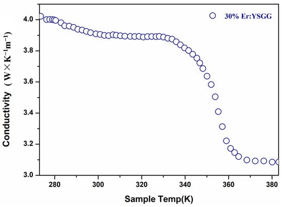 Optical transmission properties of YSGG were measured with a laser beam system using a He-Ne laser source [14]. The laser beam regulated by the diaphragm was passed through the polished crystal samples, and then, the laser spots were monitored with a detector. The beam spot and analysis of the degree of distortion are shown in Figure 4. The result showed that the laser beam was driven into the crystal, but the quality still remains, showing that the optical property of the as-grown crystal is still of high quality. As we know, the thermal effect is one of main problems limiting the laser output, so it is of vital importance that the thermal conductivity of samples can be kept stable with the rising of the system temperature. As shown in Figure 5, the thermal conductivity at room temperature (RT) is 3.92 W·m−1 K−1, and the thermal conductivity of the sample decreased with the increasing temperature. The thermal conductivity can still remain at a relatively high level, even up to 383 K. It means that our crystal with a high aspect ratio can be used to achieve a stable, highly efficient laser output.