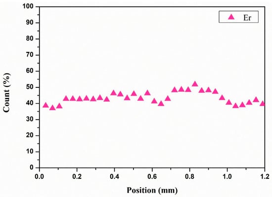 The concentration distribution of Er3+ can be seen in Figure 6, the distribution of the active ion was homogeneous along the cross section of the sample and where Er3+ occupies the position of Y3+. Hence, this proved that high doping laser crystals can be grown using the method, and the as-grown crystal can be used to increase the laser output.