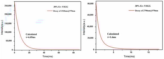 As we know, the emission band of the high Er-doped crystal is usually centered at the mid-infrared wavelength. We used a spectrophotometer to measure the absorption spectrum of the crystal, and the result is shown in Figure 7a. We found seven absorption peaks at 380, 488, 523, 652, 790, 932 and 1532 nm, and the absorption peak at 932 nm corresponds to the Er3+: 4I15/2→4I11/2 transition, which is well matched with commonly used commercial semiconductor pump sources, so the commonly used 970 nm pump source is used for Er3+-doped crystals to generate the laser. The fluorescence spectra are shown in Figure 7b; the result of the emission band centered at 2638 nm and 2817 nm clearly reflect the Er: 4I11/2→4I13/2 transition in as-grown SCFs. As we know, Er3+-doped crystals are used to obtain a laser output around 3 μm and 1.5 μm due to the two main emission peaks located at around 2.79 and 1.5 μm. Compared with a 1.5 μm laser, a 2.79 μm laser is restricted by the difference between the lifetime of 4I13/2 and that of 4I11/2. We used a spectrophotometer (FLS980, Edinburgh Instrument, Livingston, UK) to measure the fluorescence decay curve. The dimension of the crystal is Φ 2 × 2 mm3, and the end-face of the crystal is carefully polished. According to the mentioned absorption spectrum, the fluorescence decay curve is obtained under a 970 nm LD, the spectral resolution is 0.06 nm, the corresponding filter is added, and the test wavelength is 2400–3000 nm which can reflect the transition. The lifetime of the crystal can be calculated by fitting the curve; the related formula is ( is the weight of the decay time; is the result of the exponential fitting). The lifetime of Er: YSGG has a single exponential fitting. As shown in Table 2, the lower-level lifetime of Er: YAG, Er: GGG and Er: YSGG is 7.25 ms, 4.86 ms and 3.3 ms [18,24]. Therefore, Er: YSGG is a promising material to decrease the self-terminating behavior during the laser operation, so a high-efficiency laser can be obtained. Figure 8 shows the lifetime of the sample a: 4I13/2 and 4I11/2 which exerts singly exponential decay. The relevant lifetimes were calculated to be 6.05 ms and 1.6 ms, respectively.