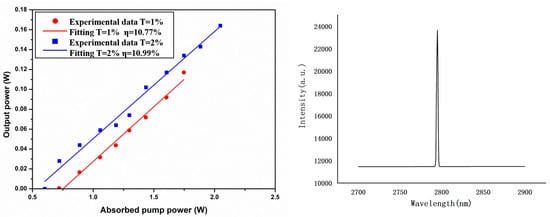 As can be seen in Figure 9, the maximum output of 166 mW was obtained when the output mirror transmission of 2% was applied, and the central of wavelength was located at 2794 nm. The slope efficiency can be calculated using the ratio of the output power to the absorbed pump power. It is worth mentioning that the absorbed pump power is the efficiently absorbed pump power, so we should subtract the laser threshold. The slope efficiency of the laser output was up to 10.99%, and because of lower hardness and small end face, the SCFs were hard to coat with the antireflection film, which will have influenced the result. On the other hand, as the SCF is air-coated, it will lead to multi-laser modes and a high loss, and the cladding of the crystal fiber can reduce the surface scattering loss and coupling pump wavelength without sacrificing the beam quality. Related research will be needed to verify the superior properties of the single-crystal fiber for achieving a higher power output. Moreover, SCF can be doped with various rare earth elements which can help to improve the output and efficiency in a 3 μm laser of Er-doped host material.
