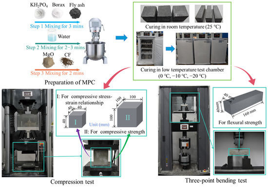 The MPC mixing ratios prepared in this paper’s experiments were based on previous studies [20]. Table 2 shows the mixing ratio parameters of MPC, where the water content was kept constant in MPC specimens, not varying with the CF content. Prior to making MPC specimens, KH2PO4 and borax need to be dried, ground, and sieved to 42 mesh. CF needs to be cleaned, dried, and cut into 20 mm pieces.