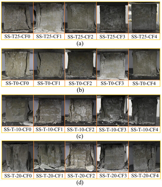 Figure 2a shows the failure modes of the specimen when the curing temperature was 25 °C. When the CF content was 0% and 1%, the specimen was loaded to the peak value, the specimen was pressurized until it made a strong crushing sound, and numerous fissures appeared on the surface of the specimen and extended to the interior rapidly until they destroyed the specimen into incomplete fragments. When the CF content was 2%, CF-MPC cracks appeared when the test loaded to destroy the specimen, and a small number of fragments fell off due to the bonding effect of CF at the cracks. When the CF content was 3% and 4%, the plastic deformation capacity of MPC was significantly improved, and although cracks appeared, no specimen fragmentation occurred. Figure 2b shows the compression failure morphology of CF-MPC at 0 °C curing. The trend of CF-MPC damage morphology with the change of CF volume doping was the same as that at 25 °C. As fiber doping increased, there was a decrease in the extent of spalling and fracture extension that occurred when the specimen was damaged. However, the growth of porosity and incomplete hydration within the specimen due to low-temperature curing reduced the compressive capacity of the specimen and caused an increase in crack extension. Figure 2c,d shows the morphology of CF-MPC curing at −10 °C and −20 °C. As the curing temperature declined, the free water in the specimen froze and inhibited the hydration of the MPC. At this time, the strength and deformation resistance of the specimens were severely reduced, causing CF-MPC integrity degradation when damaged. Moreover, under the low-temperature environment, the CF and MPC could not bond well, and adding fibers increased the pore space of the matrix and reduced CF-MPC densification.