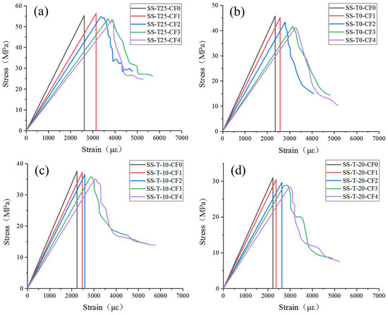 Stress–strain curves of CF-MPC: (a) curing at 25 °C; (b) curing at 0 °C; (c) curing at −10 °C; (d) curing at −20 °C.