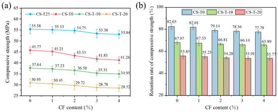 Compressive strength of CF-MPC: (a) compressive strength; (b) retention rate of compressive strength.