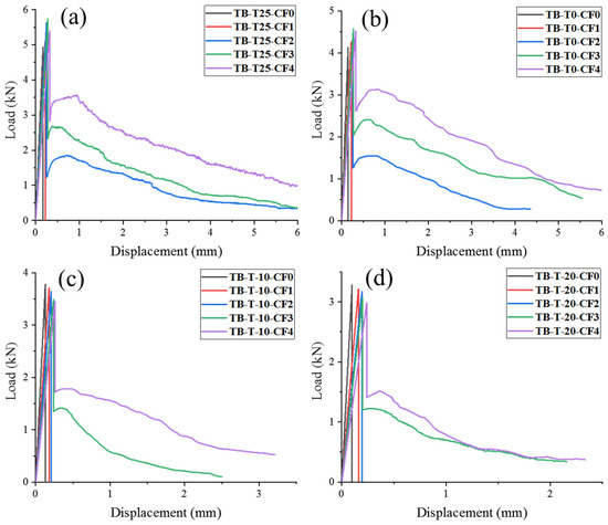 Load–displacement curves of CF-MPC: (a) curing at 25 °C; (b) curing at 0 °C; (c) curing at −10 °C; (d) curing at −20 °C.
