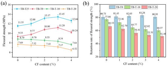 Flexural strength of CF-MPC: (a) flexural strength; (b) retention rate of flexural strength.
