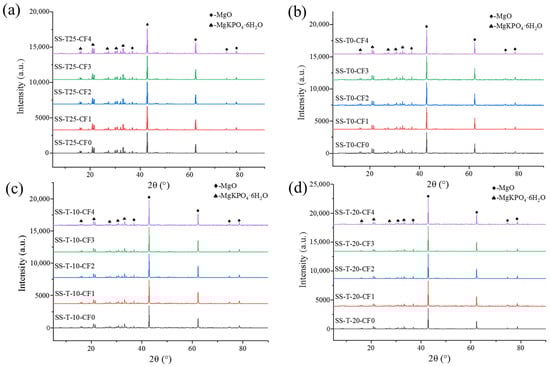The XRD diffraction patterns at various curing temperatures for CF-MPC chemical compositions are shown in Figure 8. It can be found that the diffraction peaks were mainly distributed in the range of 10~80°, and the physical phase was analyzed in the range of the diffraction angle. The primary hydration product of MPC after 28 days at each curing temperature was MgKPO4-6H2O, and the diffraction angle was more intensive in the range of 15~35°. Furthermore, MgO crystals that were not involved in the hydration event were also present in the matrix, and their main diffraction angles were in the ranges of 40~45°, 60~65°, and 75~80° [32,33].